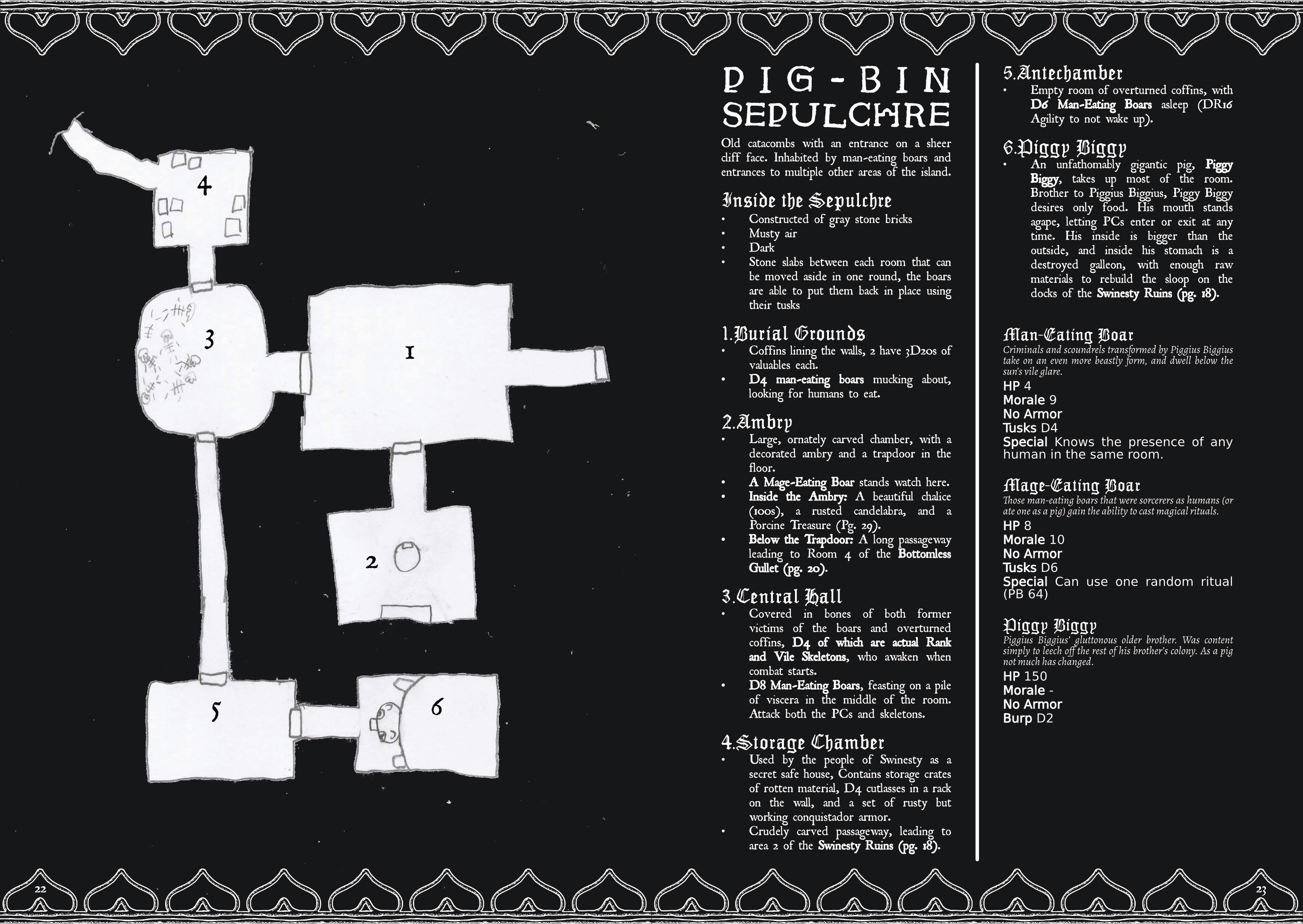 This is my first time testing the water with adventure design on a large scale, and any feedback is appreciated! If you’ve run the adventure and want to provide feedback, share what happened, have any suggestions, want to gush about how hot Piggius Biggius is, or anything else, leave a comment here or leave your thoughts on the Pirate Borg discord. I’d love to hear anything you’d have to say!